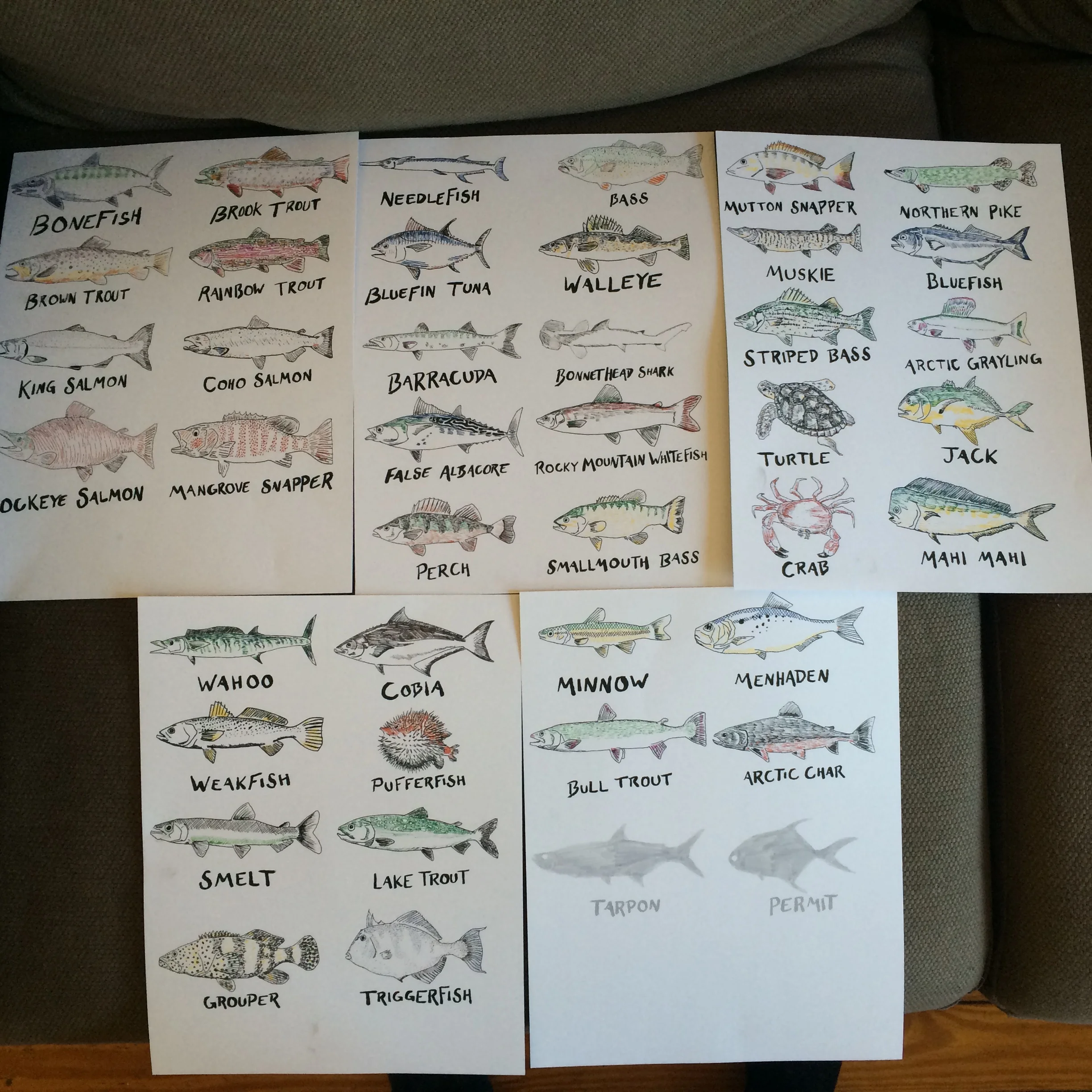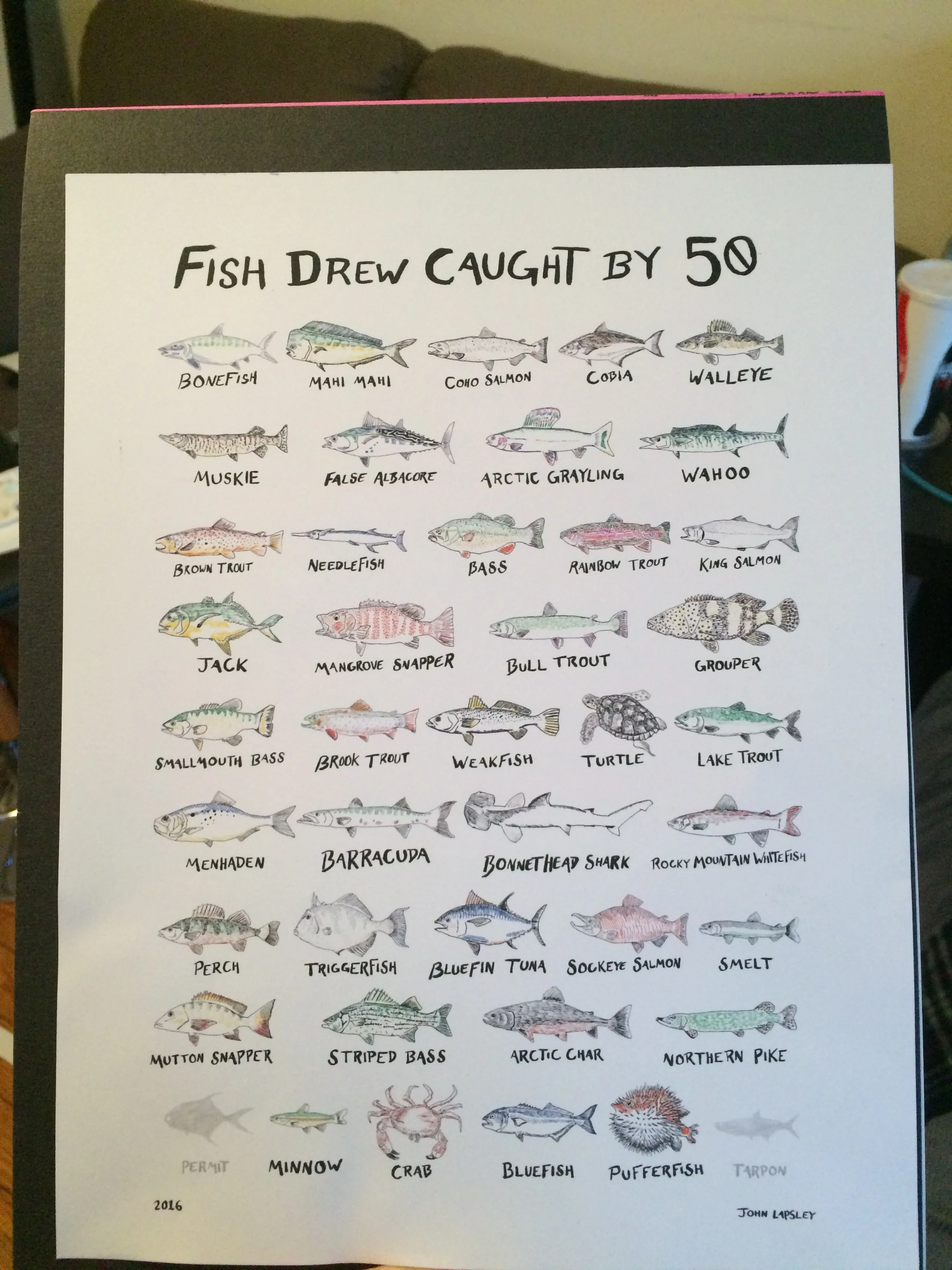 This was a gift for my dad's fiftieth birthday - he's an avid fisherman, so one day I had him list all of the fish he had caught and any that he wished he had caught but hadn't (tarpon and permit, in grey).