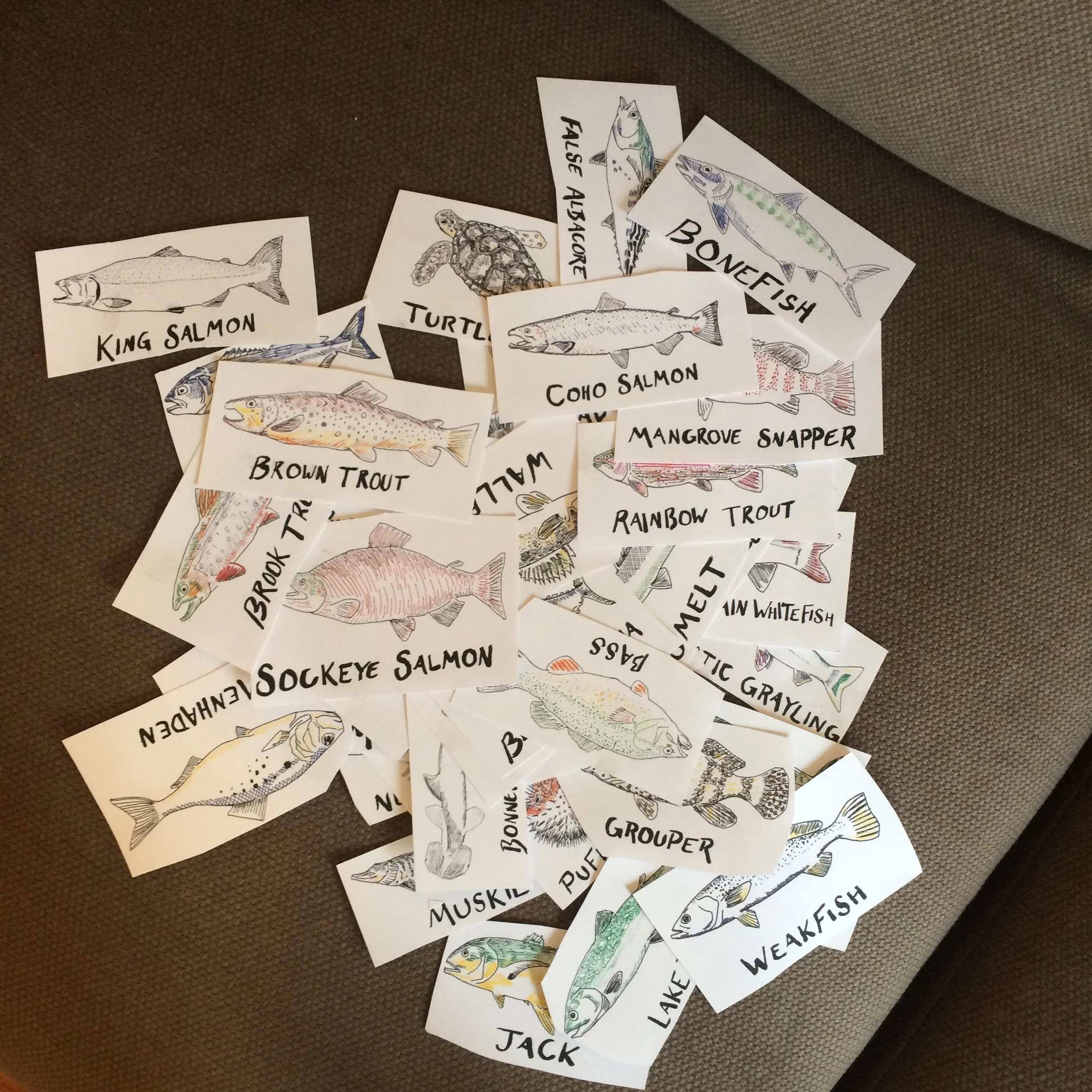 Below are photos of the process of organizing the fish and deciding the order. Drawing the fish took 3-4 weeks, laying it out took a Saturday afternoon. I think he liked it.
